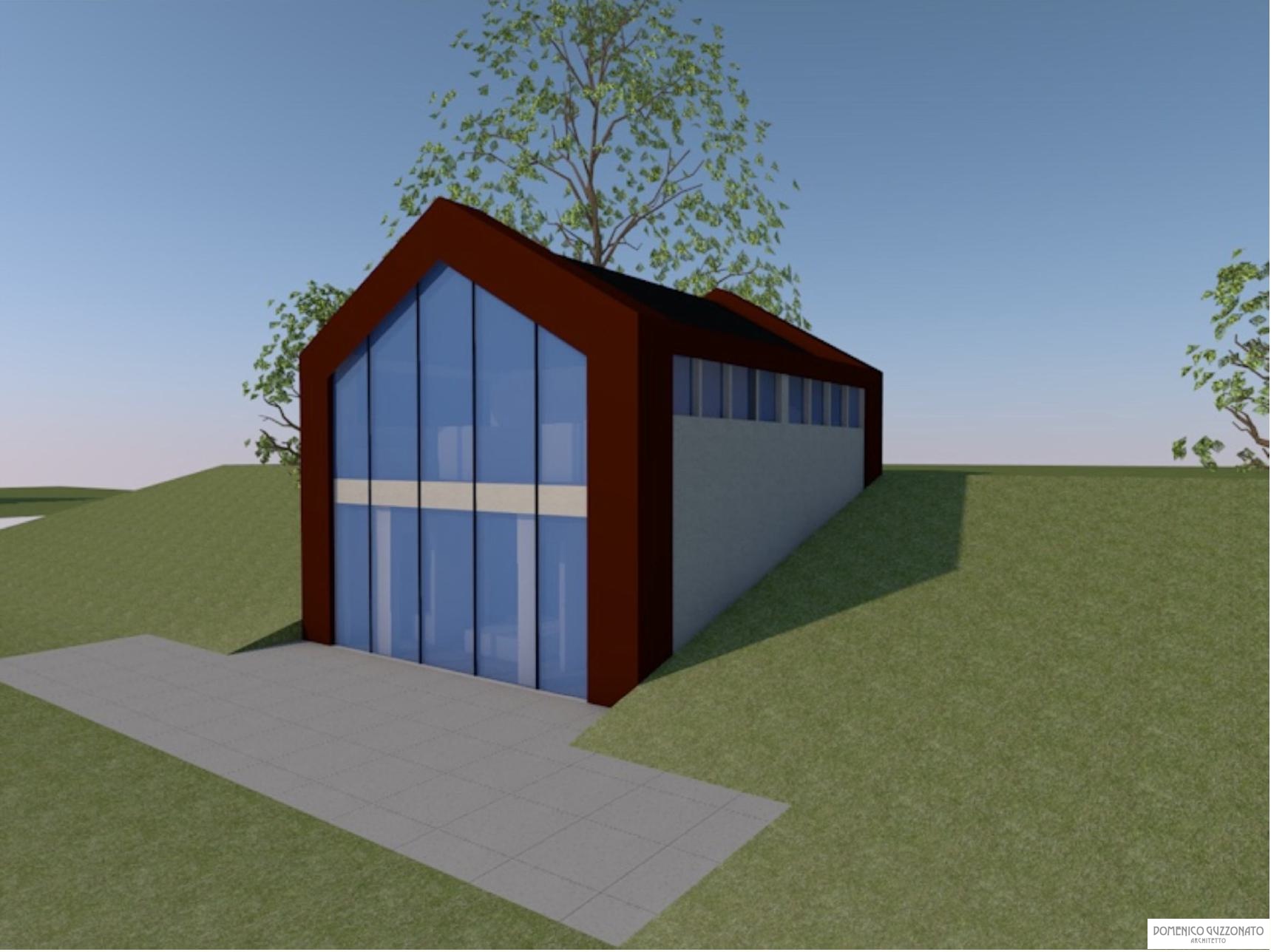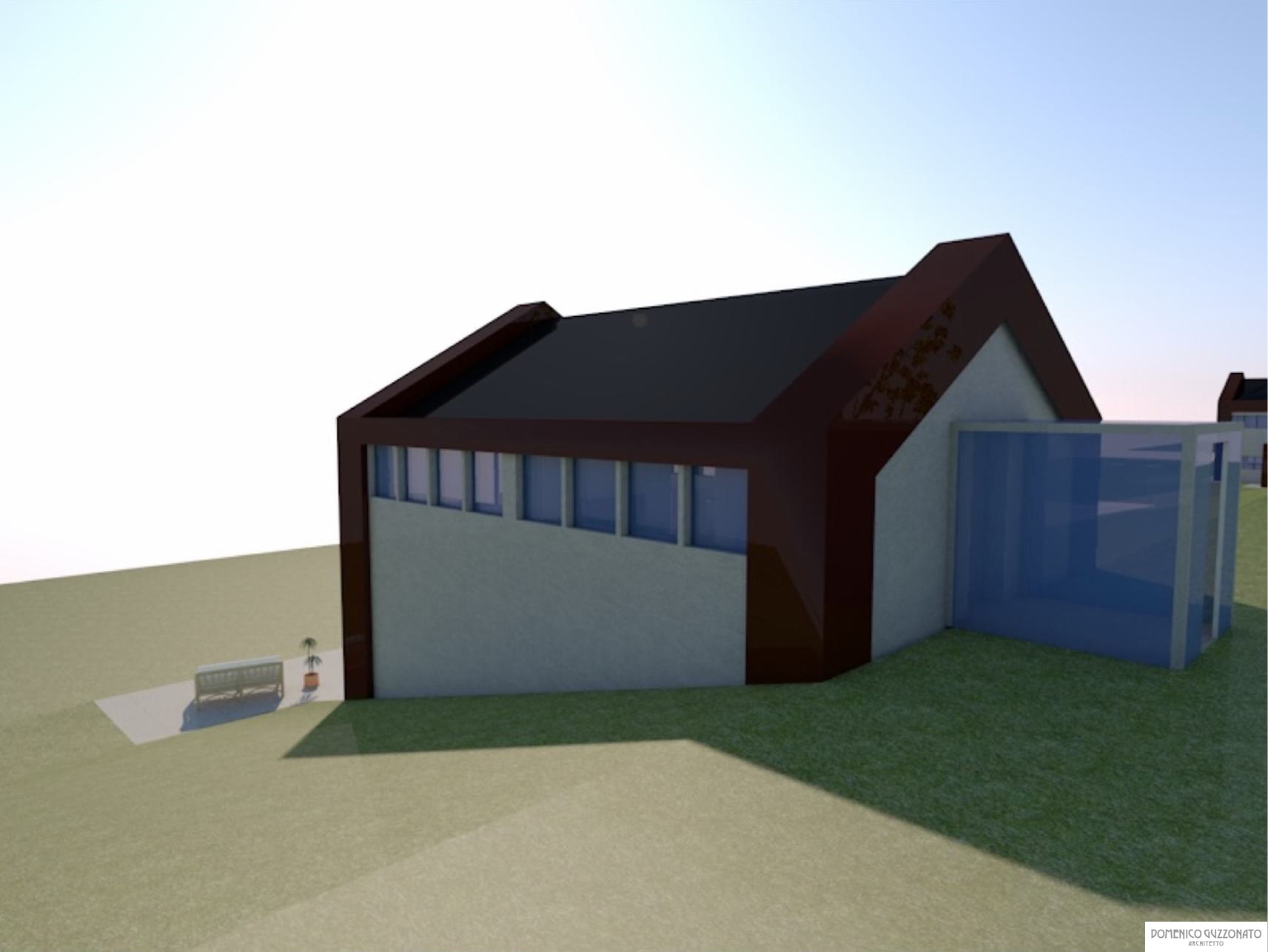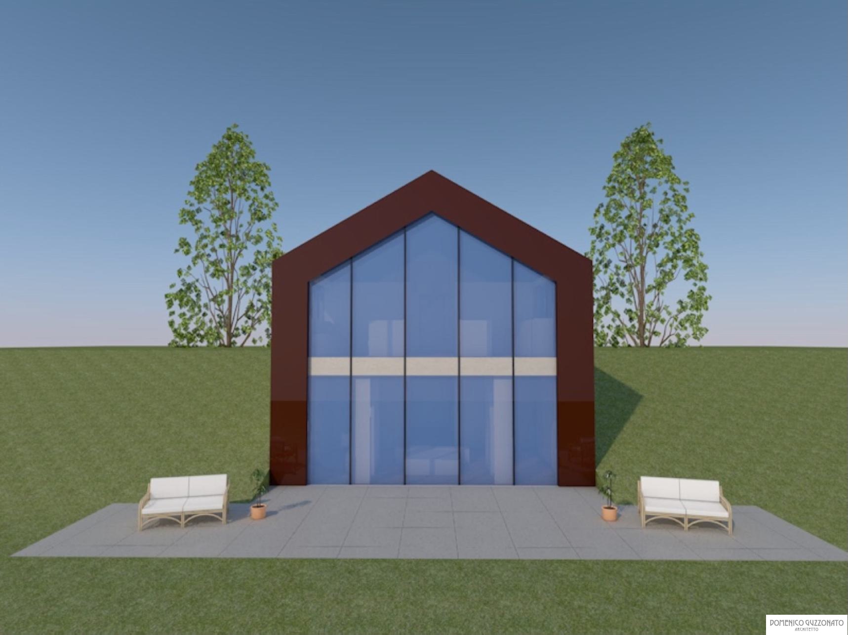 Progetto di residenza minima in zona collinare a declivio, Casa Minima è costituita da un volume pure, evidenziato da masti verticali angolari in acciaio corten, i quali profilano la selezione di copertura a falde che racchiude ampie vetrate a valle e un ingresso a volume trasparente a monte.
