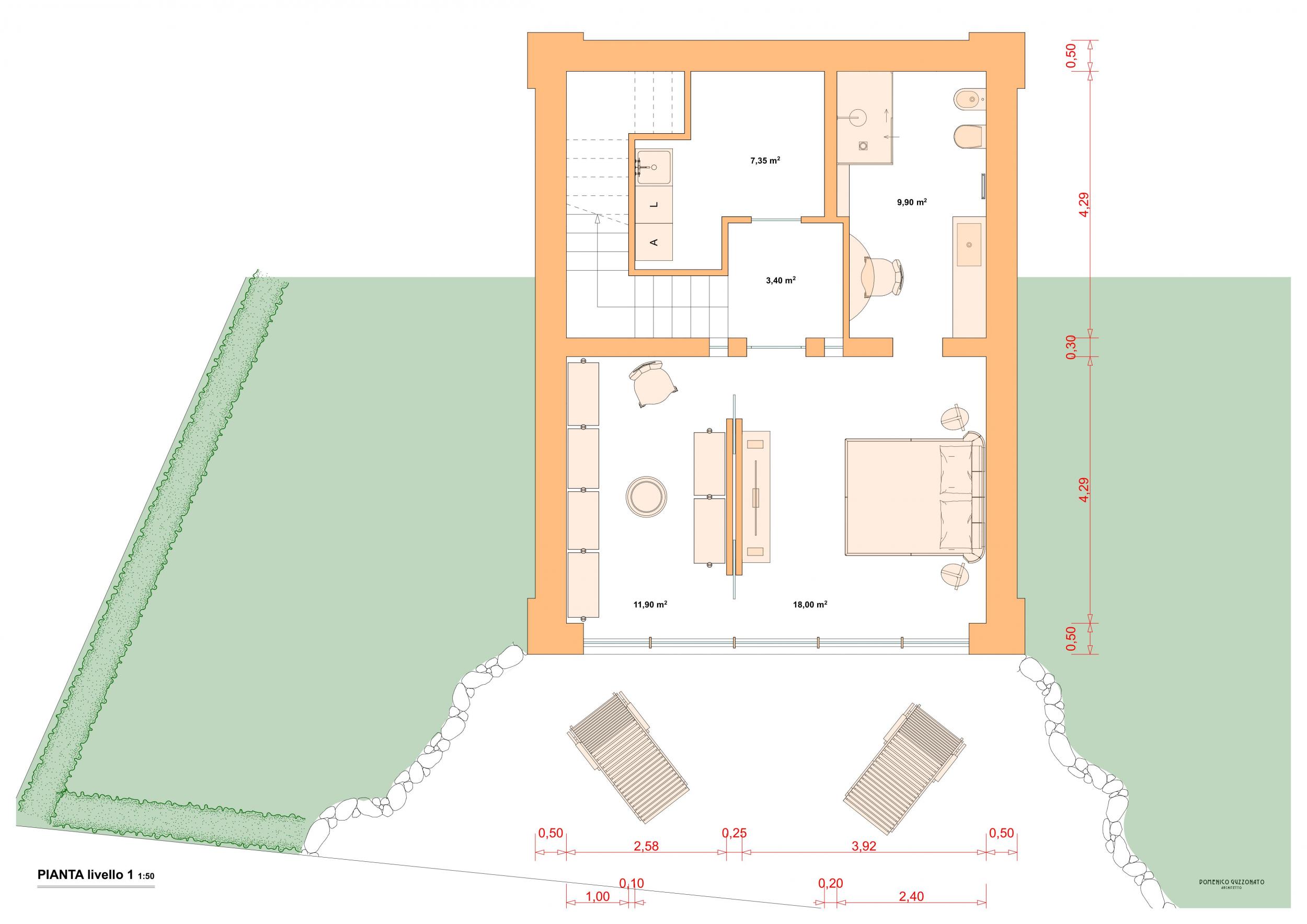 Internamente, la netta bipartizione planimetrica scinde gli spazi di servizio da quelli di convivio. Il pieno parietale delle due murature longitudinal a stucco è interrotto dalle finestrature continue, in linea di gronda.