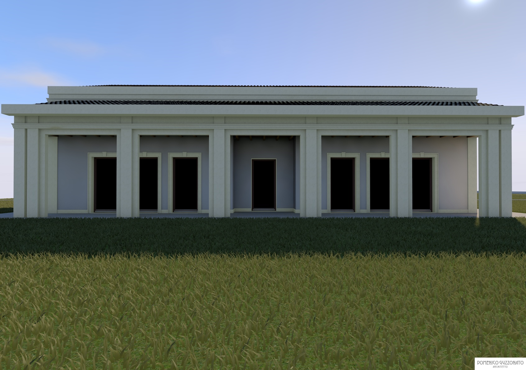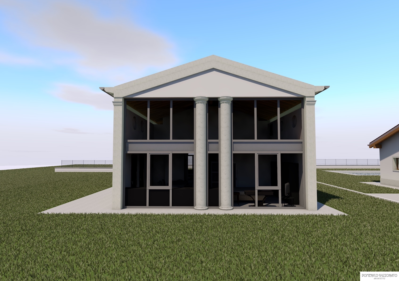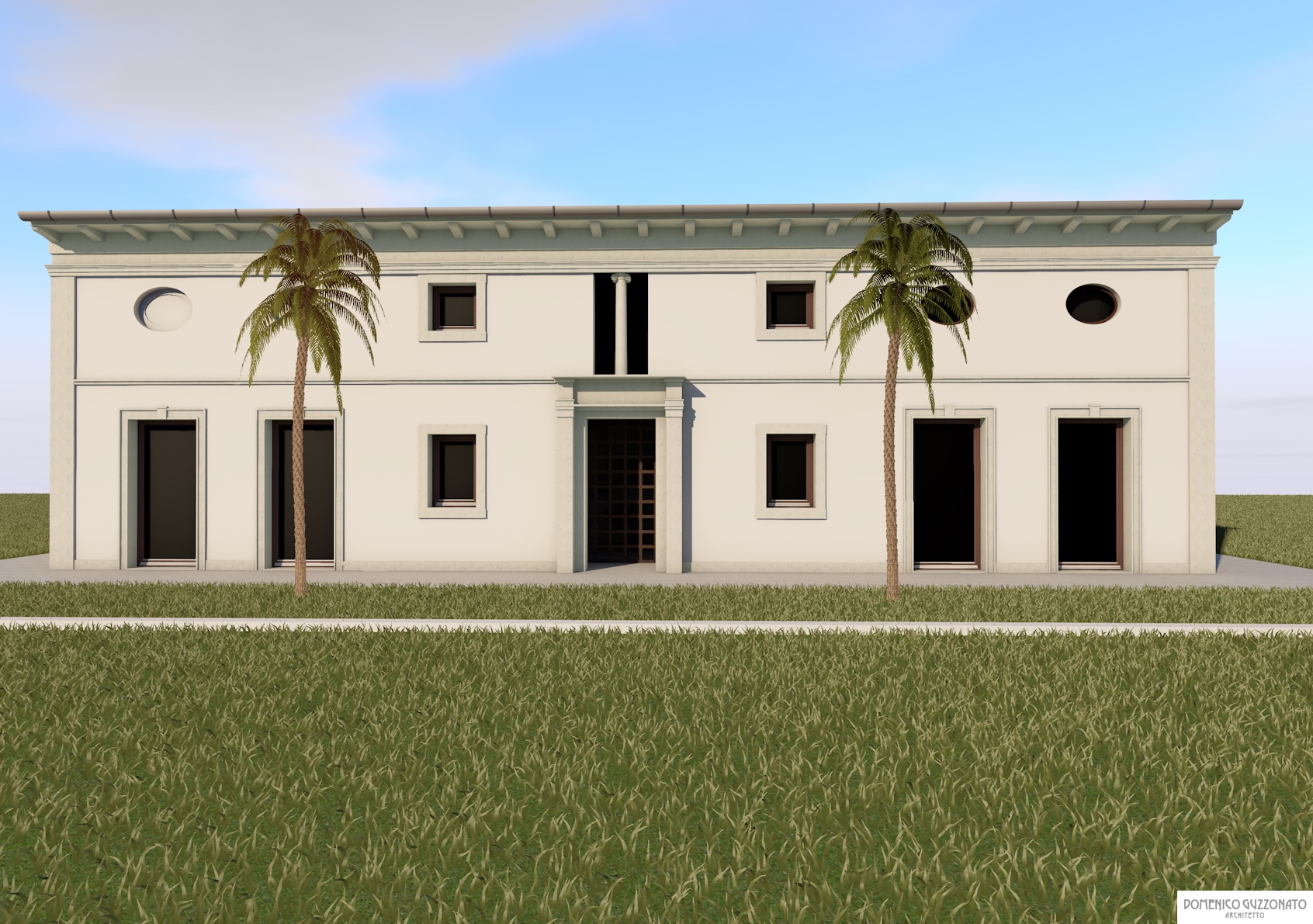 Simmetria e rigore vengono dissimulate dalle trasparenze a tutta facciata, dal doppio ordine gigante, dall'evidenza dell'ingresso tra portale e bifora sovrastante, dall'ampio spazio porticato a stoai.