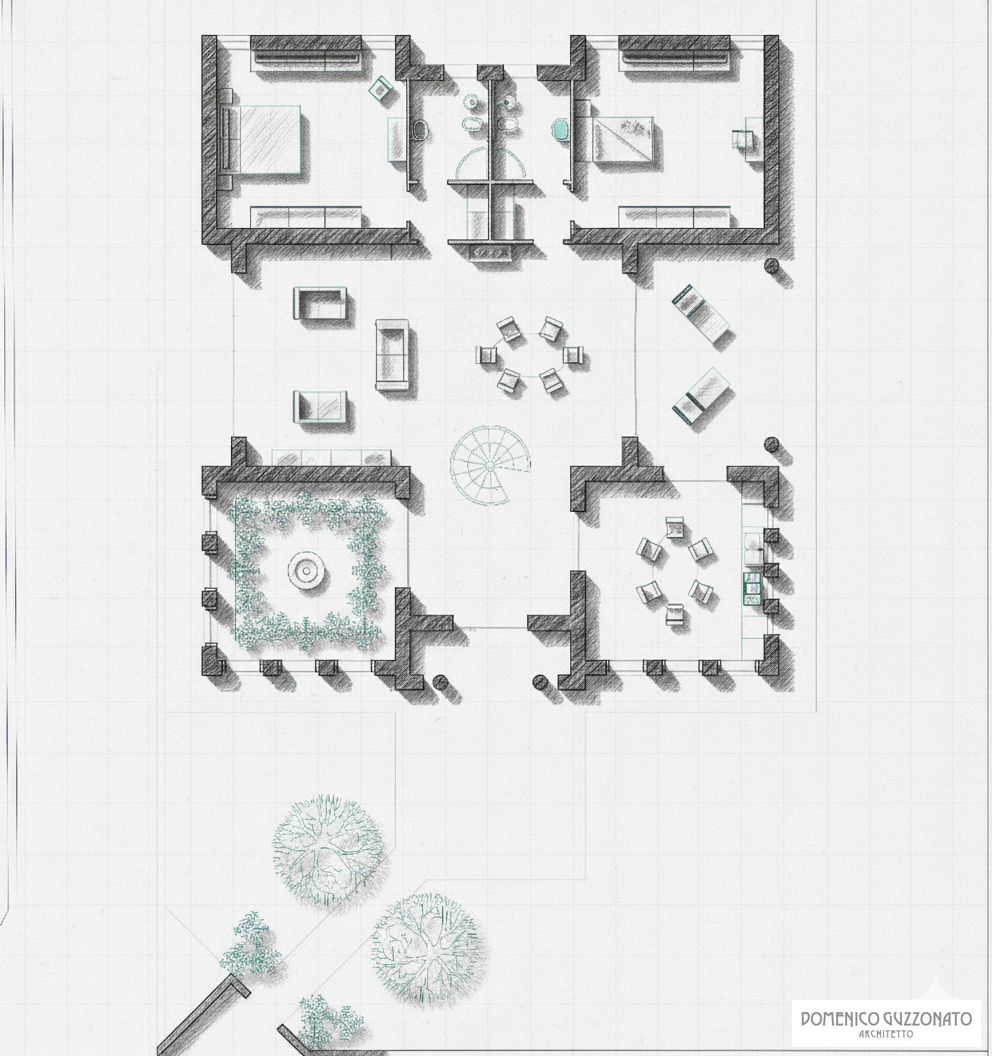 L'ipotesi progettuale Casa Patio si sviluppa a partire da principi compositivi estremamente semplici, basati sulla forma geometrica del quadrato e sulla sua variazione modulare, la cui composizione formale è data dalla simmetria sia in planimetria che in alzato, pur sempre in linea con le proprietà compositive di centro, direzione e ritmo dello spazio concreto.