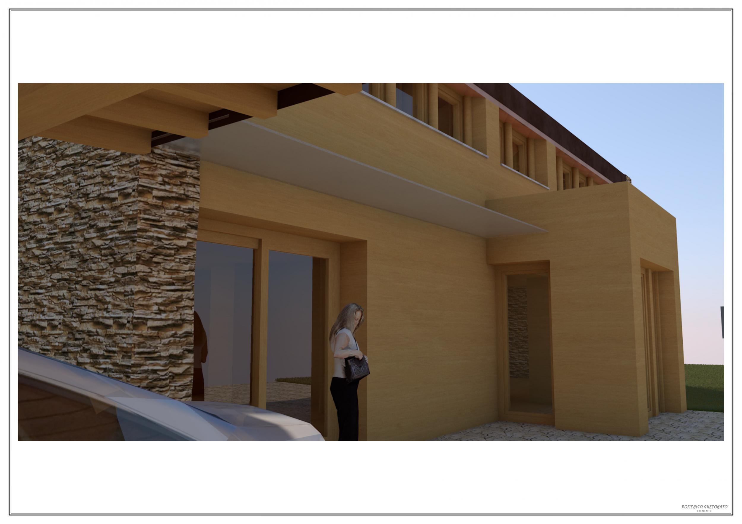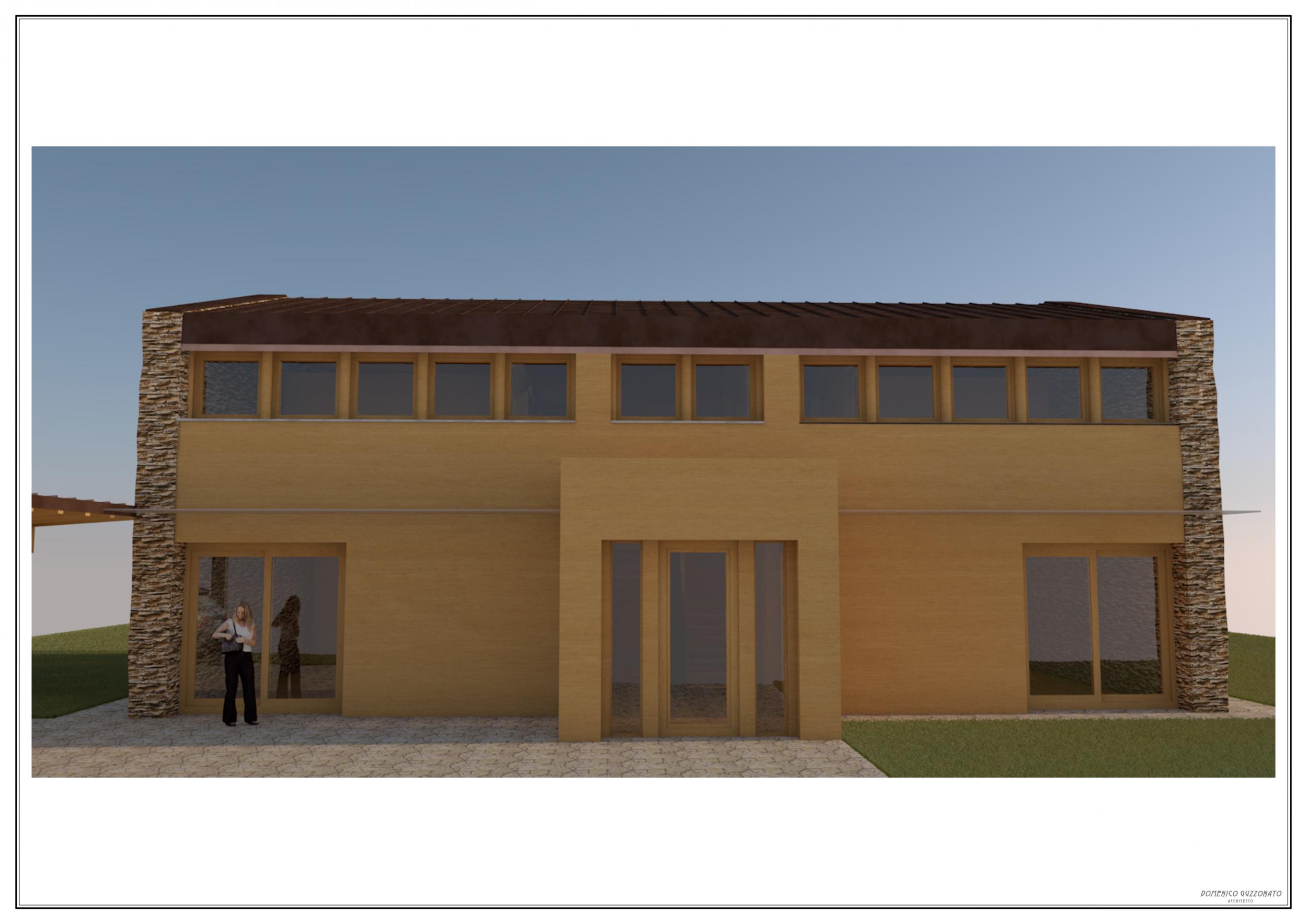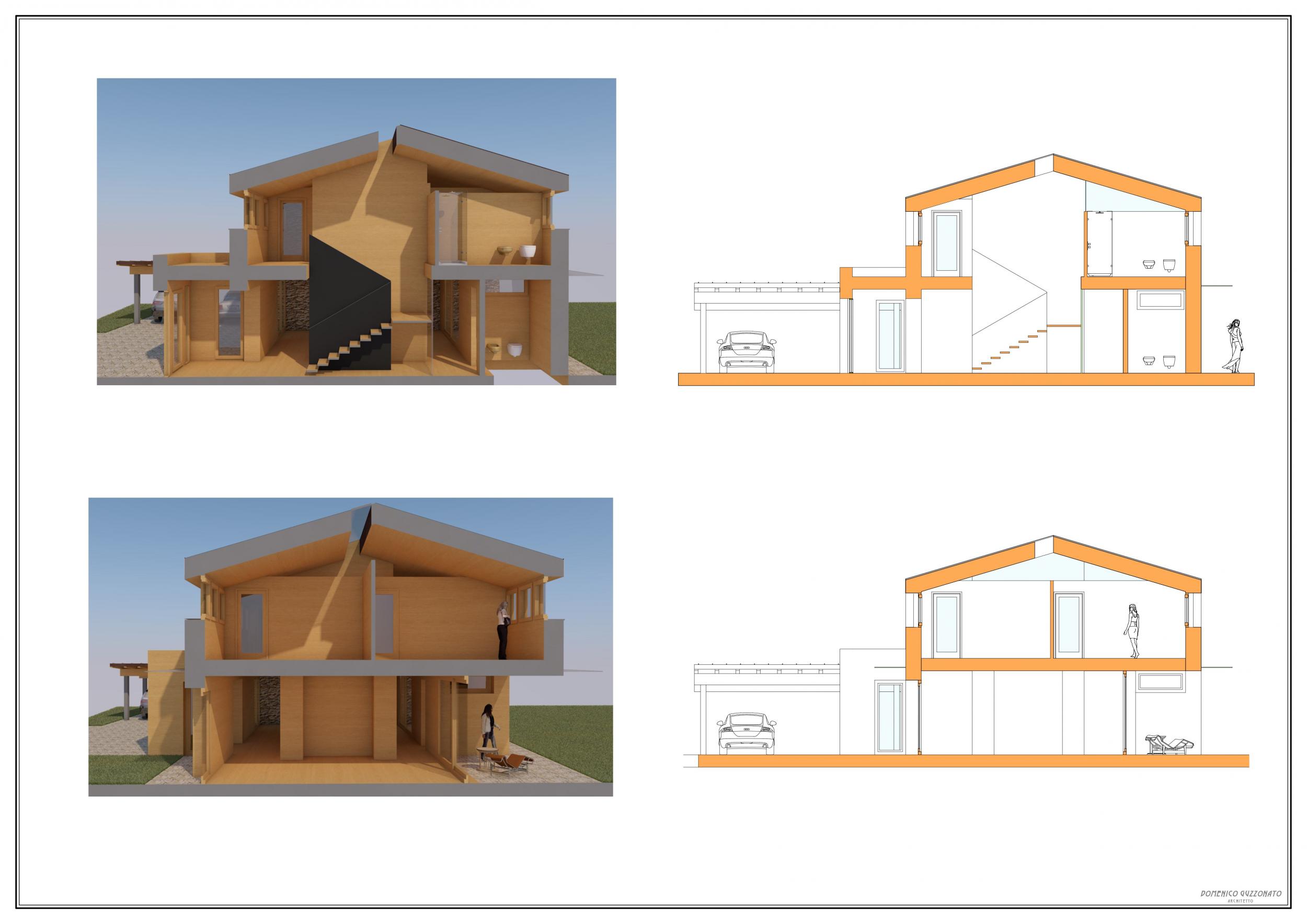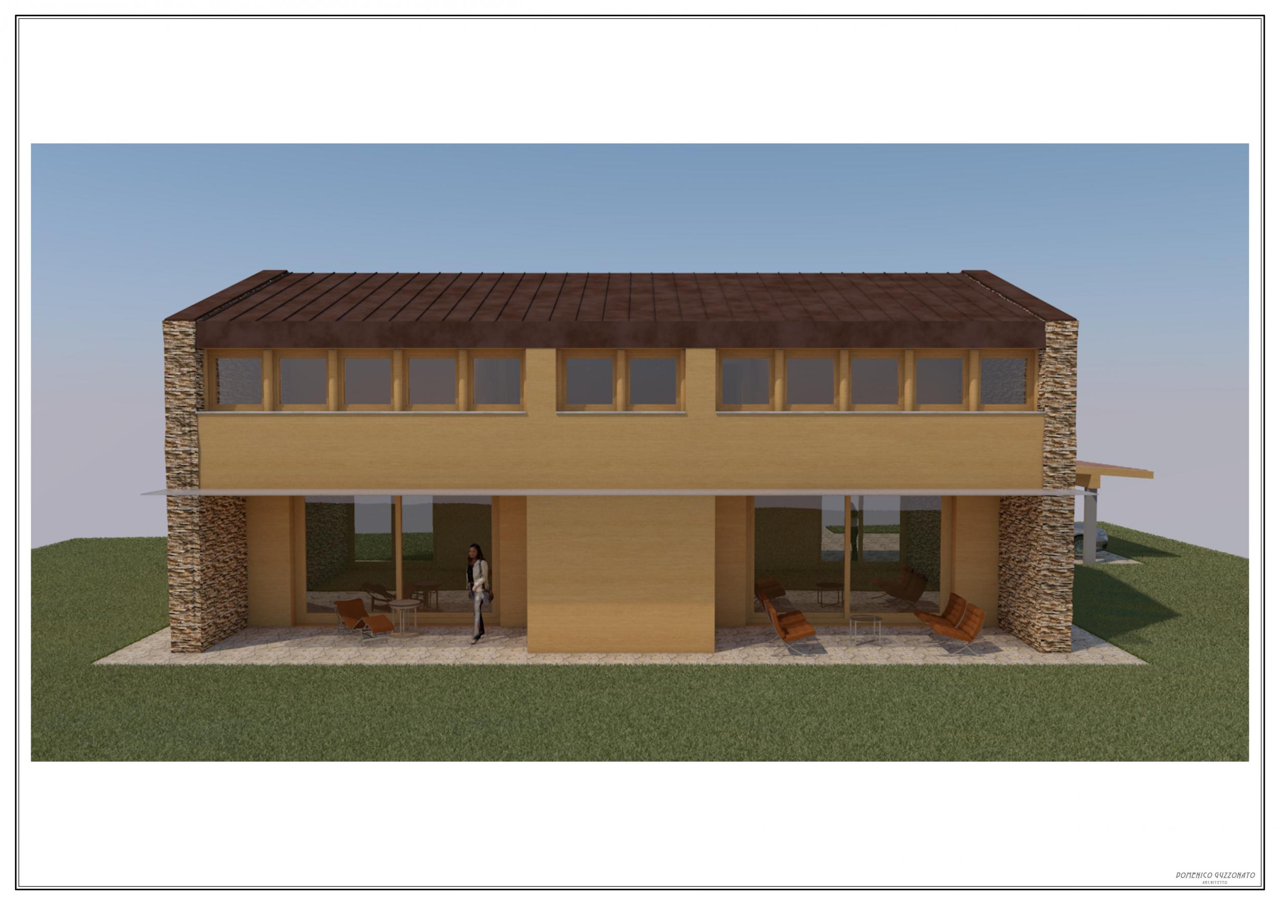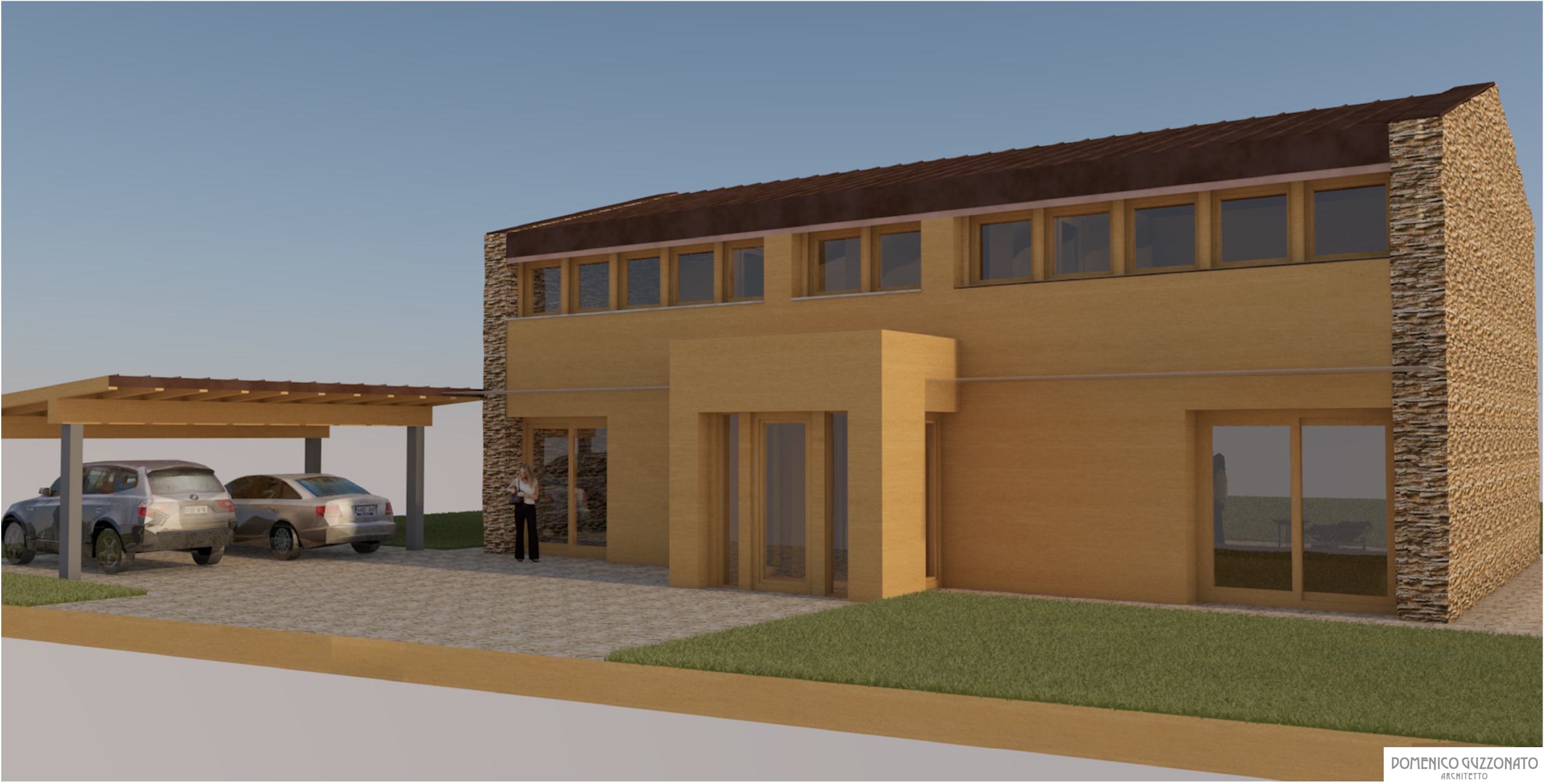 Studio di casa unifamiliare in legno strutturale con pannelli di finitura interni ed esterni in legno naturale, il progetto gioca su una simmetria centrale sia in pianta che in alzato. Difatti, si è pensato di partire da un volume puro e semplice, a due falde, a cui imporre una sottrazione di elementi per generare il ritmo di pieni e vuoti. Questo ritmo viene a sua volta messo in pausa da due testate contrapposte materiche di tutto pieno e variazione di materiale con finitura in pietra a spacco.